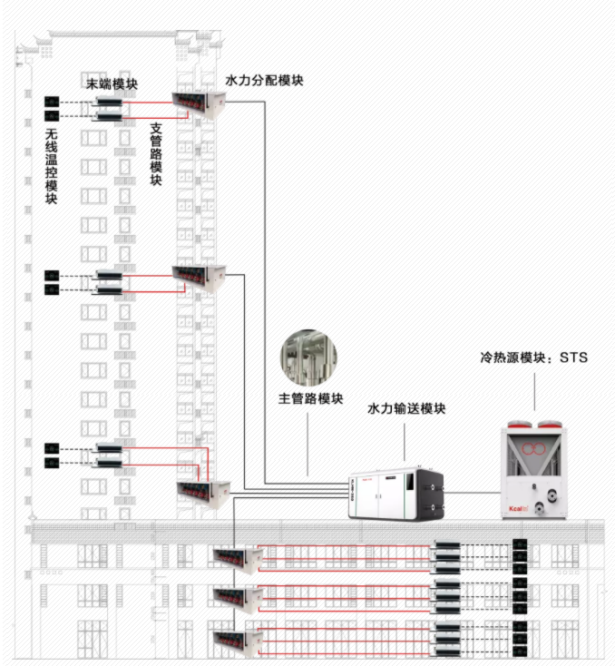 基于STS空气源热泵作为冷热源设备的智能集成装配式模块化中央空调系统,全部采用工程产品化、产品模块化、系统集成化、集成智能化设计理念,将冷冻水泵组、冷却水泵组、水处理装置、定压补水装置及电气配电、控制系统全部集成于一体,在出厂前完成整机装配和测试,作为单台整体运输,在安装现场只需连接主管路及主电源即可。内置一体化智慧控制系统,可与楼宇自控系统无缝对接,远程在线大数据监测,一键启停智能化管理。装配式模块化集成智能中央空调系统可大幅度降低施工难度、缩短施工周期、减少机房占地面积,智慧控制明显降低运行费用,持续响应绿色生态,节能降耗的健康理念。